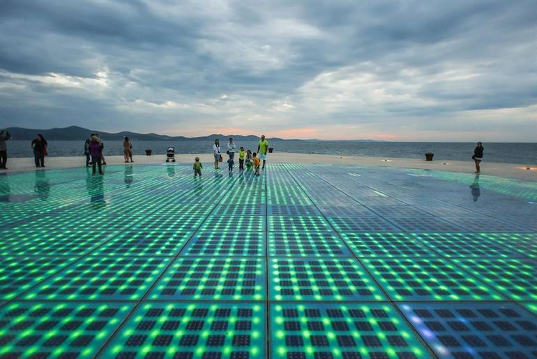 Een marmeren trap leidt je van de promenade naar het water. Daar zie je een reeks pijpen waar de wind en golven mee spelen. Dat zorgt voor vreemde, geheimzinnige muziek die uit de gaten in de bovenste treden klinkt.