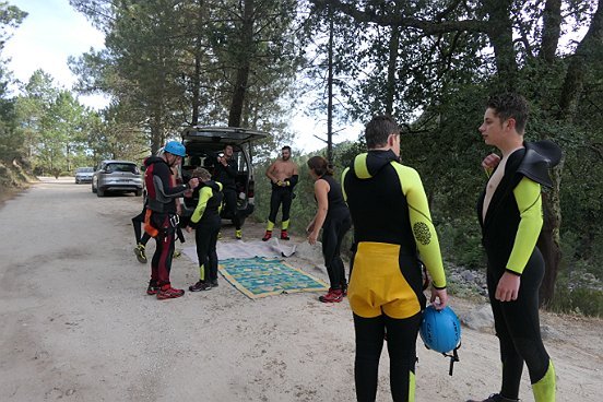 Ten tweede trekken we de wetsuits, de schoenen en het veiligheidsmateriaal aan. Vervolgens moesten we een kwartiertje klimmen door het mooie landschap.