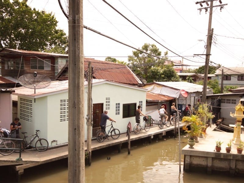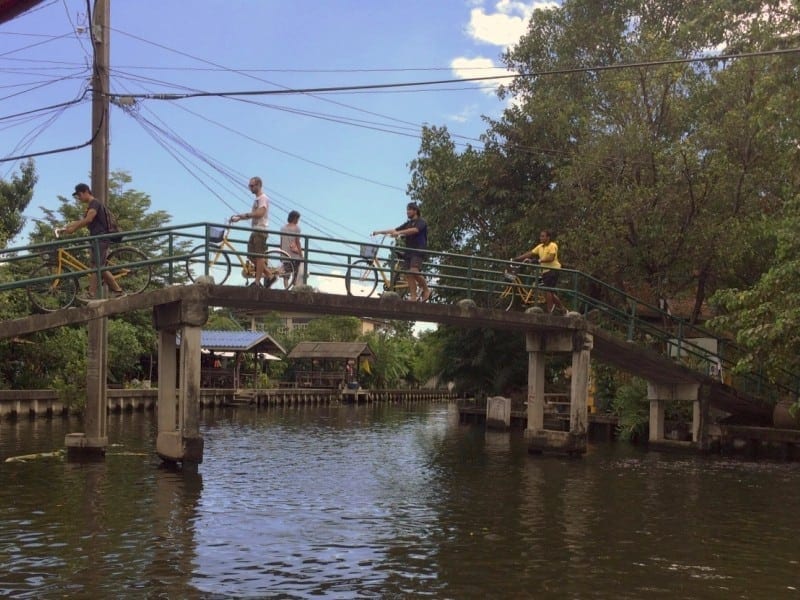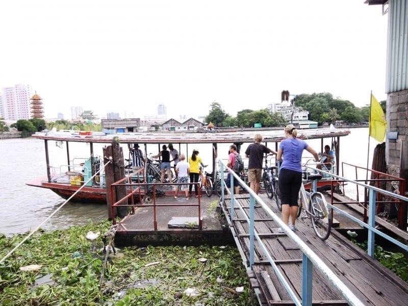 Halverwege de tocht verlaten we Chinatown en steken de Chao Phraya rivier over. Met een magistraal uitzicht op de skyline van de stad achter ons fietsen we Thonburi in, dat ooit de hoofdstad van Thailand was (Thonburi was historisch gezien de derde hoofdstad van Thailand). Je merkt meteen dat dit deel van de stad veel rustiger is. Er is veel meer groen en de mensen zijn er gemoedelijker, vriendelijker. We fietsen door woonwijken, zo af en toe begroet door glimlachende bewoners. We hebben nu echt de gebaande paden verlaten. We ervaren nu het echte Bangkok.