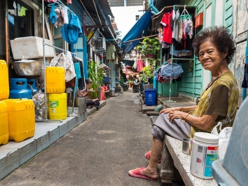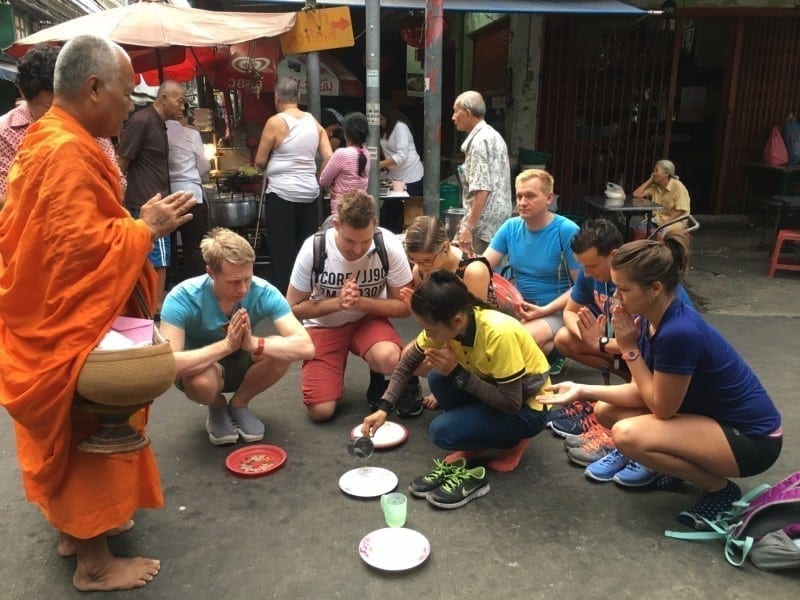Deze tocht begint in het hart van Chinatown, een van Bangkok’s meest bedrijvige buurten. We fietsen door bochtige nauwe steegjes, afgewisseld door overdekte markten, loodsen, winkeltjes, en ateliers. De geluiden zijn afkomstig van werkplaatsen; de geur is afkomstig van kokende mensen op straat. De lokale bevolking is voornamelijk boeddhistisch. Ze bezoeken tempels in de buurt, doen aan rituele verbrandingen van papier, geloven in geesten. Dit alles is onderdeel van een eeuwenoude cultuur.